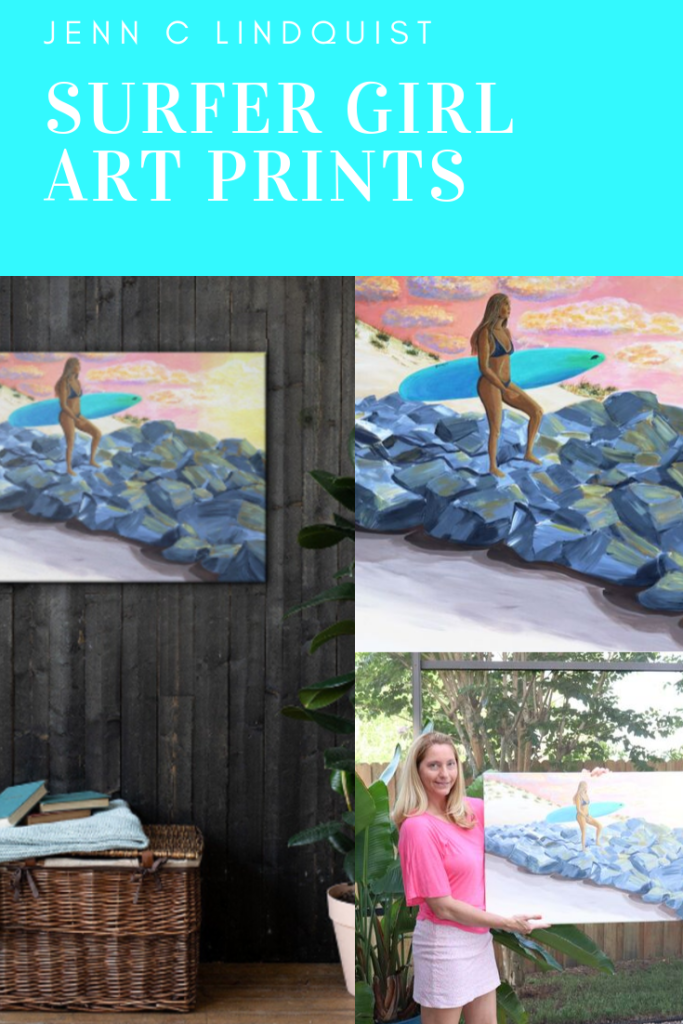 This beautiful original painting of a surfer girl walking on the jetties will be a lovely addition of coastal decor to your beach house. Also, consider this as a gift for the surfer girl in your life.