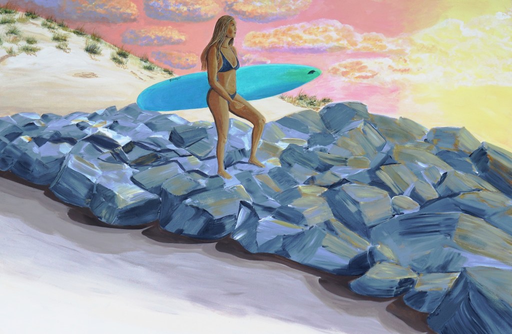 This painting is the first in my Surfer Girl at the Jetties series. She was inspired by a young lady that I watched walk across the Jetties at Ponce Inlet, to the surf on the other side. I was so inspired that I decided to base an entire series on this one experience.