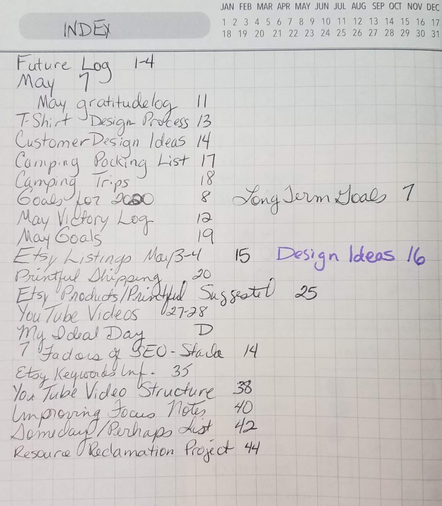 The bullet journal is a place to write down what comes to mind. Everything can be referenced using the index. This can include projects, notes, goals, trackers or whatever you keep track of.