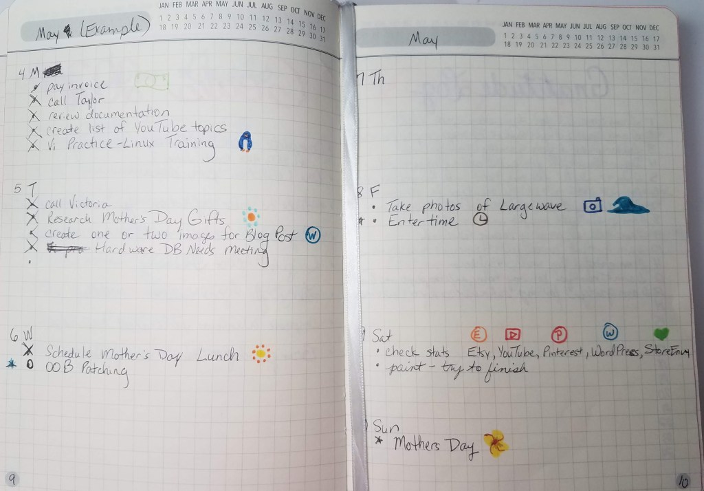 Create a One month log with a running task list. Don’t worry about filling in every date. If you have something that’s specific to a date, like Mother’s Day or Dinner with parents write it in the monthly. Otherwise, you should be able to add it to the running task list on the right.