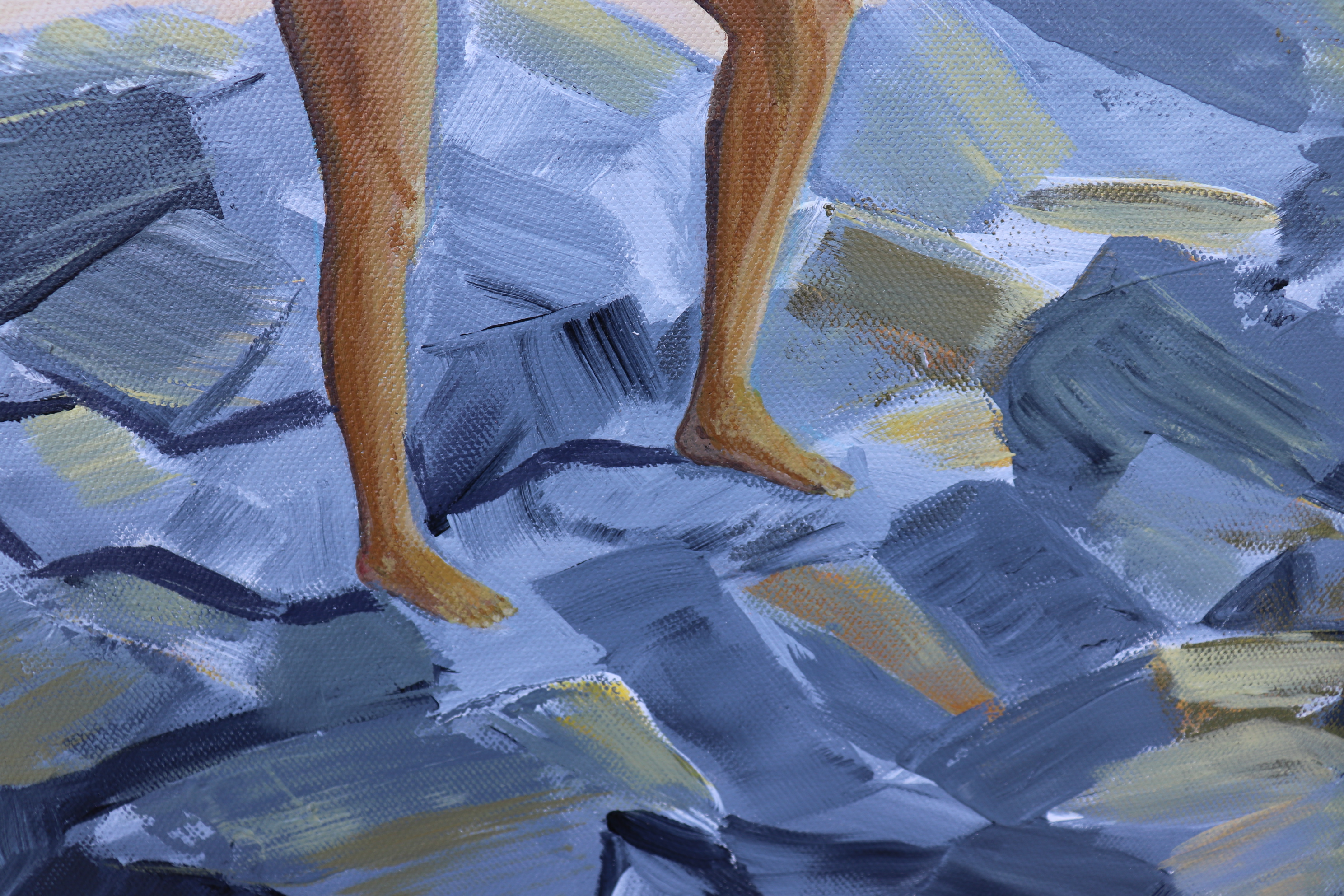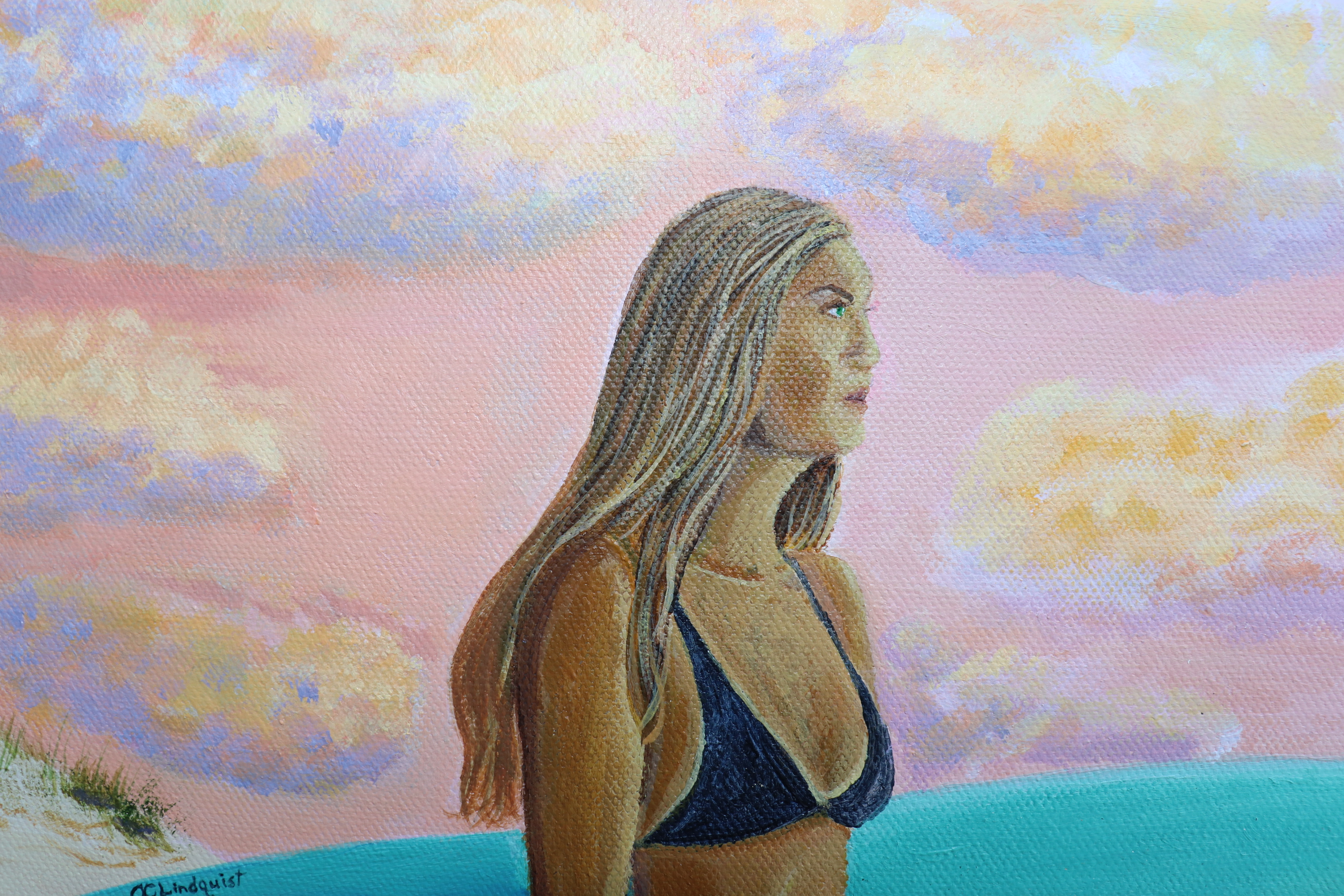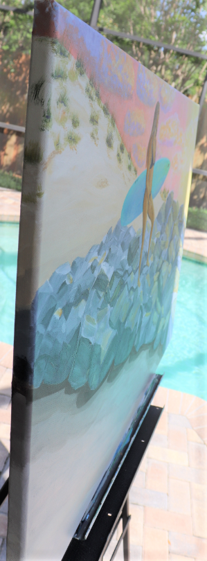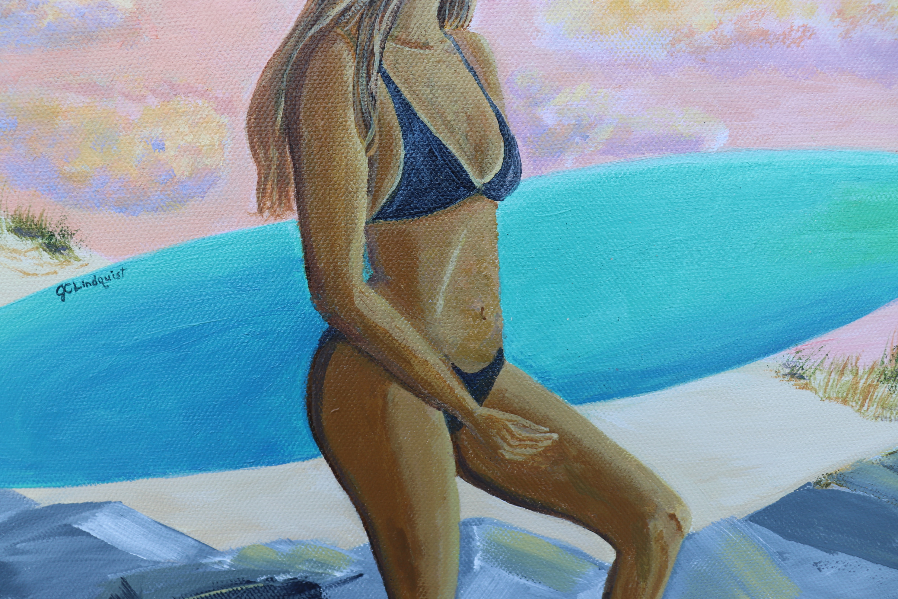 This painting is the first in my Surfer Girl at the Jetties series. She was inspired by a young lady that I watched walk across the Jetties at Ponce Inlet, to the surf on the other side.