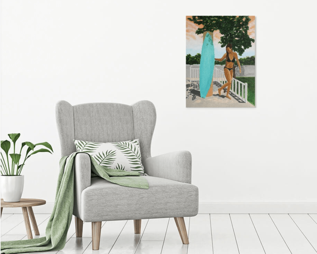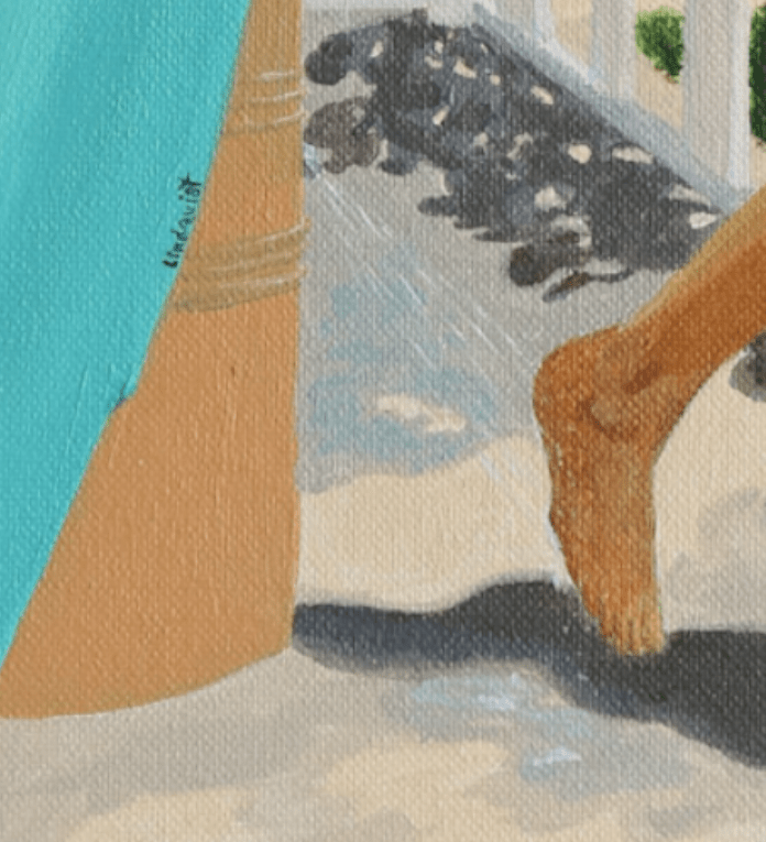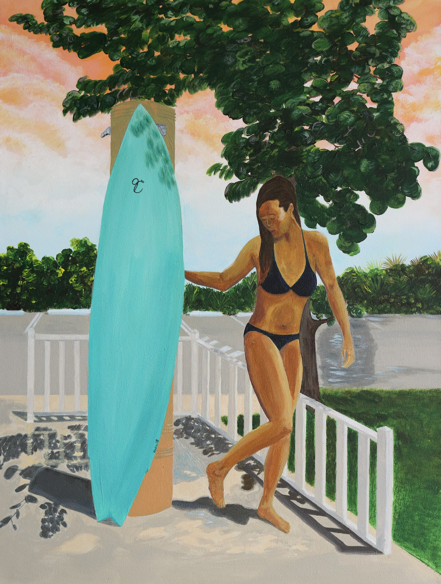 This is one in a series of beautiful surfer girls. This girl is showering off after her surf session. Occasionally, I surf at Wilbur-by -the-Sea near Ponce Inlet with my family. This painting is based on the showers near the boat house.