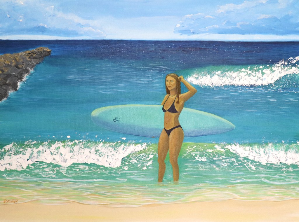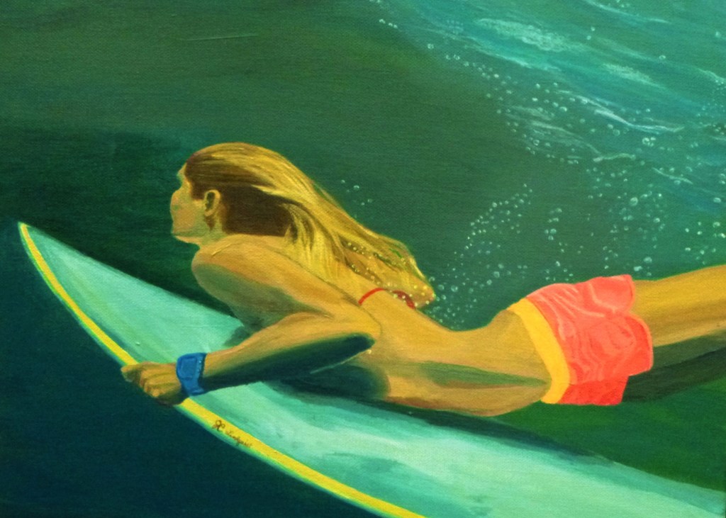 My “Surfer Girl” series is painted on stretched canvas of varied sizes. Underwater paintings are based off a reference photos taken by amazing surf photographers. (All photos have been used with permission).